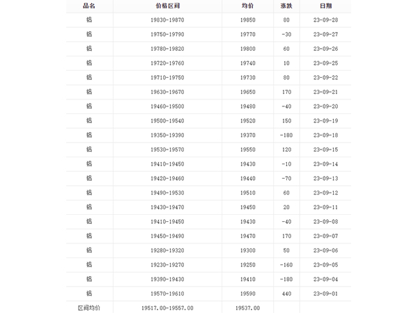 九月,这个月的区间价格是19517元/吨-19557元/吨,均价是19537元/吨,这个月跟前面几个月比价稍微涨了点,但是总体来看幅度不是很大,具体每天的价格大家可以自己在图片种看看。
