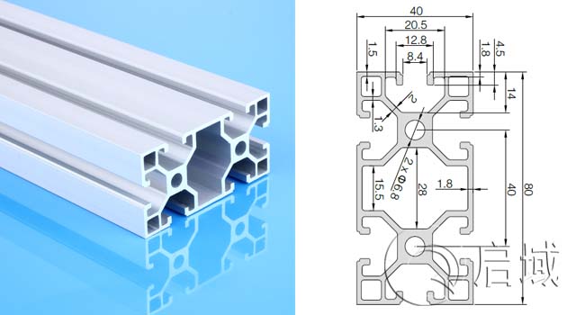 欧标4080直角铝型材之重型的货号为QY-8-4080E,这款铝型材和轻型一样是属于槽8系列铝型材中的一款。它的壁厚为2.5MM的,斜筋厚度为2.5MM的,中间孔距为Ф6.8的。那它的应用范围和上面说的是一样的吗?不用猜,咱们接着看吧。
