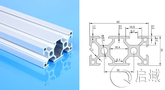 3、国标3060型材,货号:QY-6-3060G。属于6mm槽宽系列,适用于轻型结构的框架组合。单位质量是1.95kg/m。它通常采用对边为10mm的M5、M6四方螺母与圆柱头内六角螺栓连接方式,或国标10F系列T形螺母与圆柱头内六角螺栓,也可采用国标10F系列T形螺栓与法兰螺母连接。